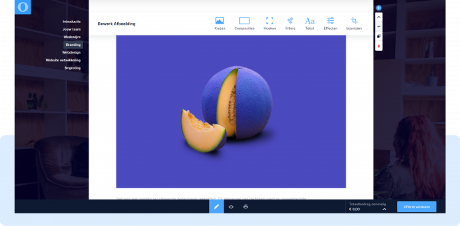 - Effecten: Je kunt de effecten gefixeerd of parallax toepassen op je afbeelding, dit geeft een mooi effect bij het scrollen door de offerte.