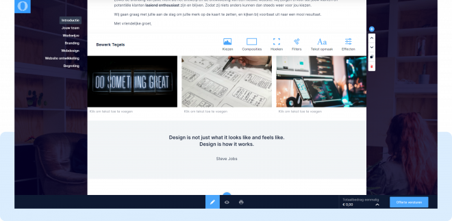 - Effecten: Je kunt de effecten gefixeerd of parallax toepassen op je compositie, dit geeft een mooi effect bij het scrollen door de offerte.