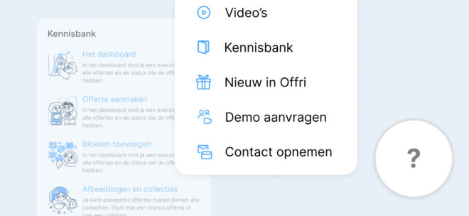 We doen ons best om de makkelijkst denkbare offertetool te maken. Toch heb je soms hulp nodig. Onze kennisbank, video’s, de laatste features en onze helpdesk hebben we makkelijk ontsloten via het vraagteken dat je nu altijd rechtsonderin Offri aantreft.