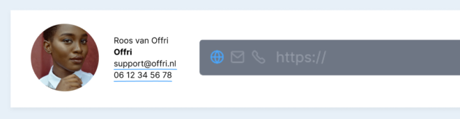 Naast een webadres kun je ook een emailadres of telefoonnummer linken in de teksteditor. Zo is het voor de ontvanger nog makkelijker om contact met je op te nemen. Gebruik een email of telefoon link bijvoorbeeld bij de contactgegevens van de afzender.