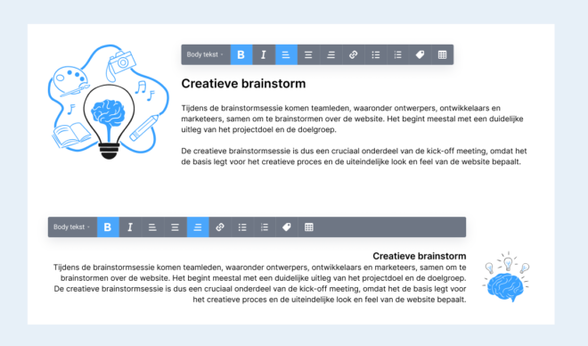 Links, rechts of gecentreerd. Je kunt zelf je teksten uitlijnen in de teksteditor. Meer vrijheid in het vormgeven van je offerte dus. Ook te combineren met de uitlijning van afbeeldingen.