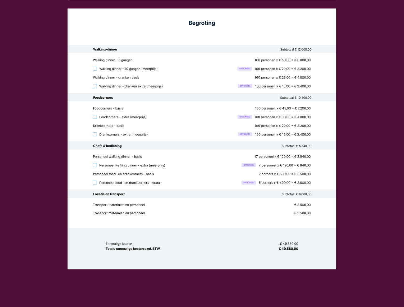 In de begroting voeg je makkelijk extra optionele posten toe. Je maakt het overzichtelijk en makkelijk voor de klant om dat extraatje mee te pakken.