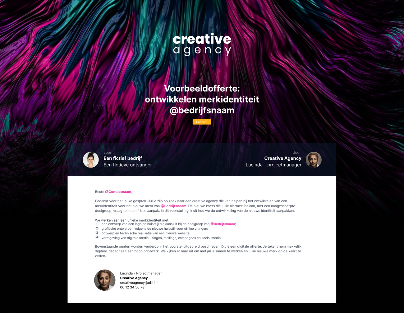 Naast het gemak van het maken van offertes, kan je met Offri ook inspiratie opdoen voor het maken van jouw eigen unieke offertes. Bekijk voorbeeld offertes om te zien hoe je een verhaal kan vertellen aan jouw doelgroep en hoe je de templates kan hergebruiken voor een gerichte offerte.