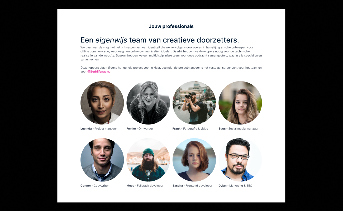 Maak het persoonlijk en stel jouw team van professionals voor aan de toekomstige klant. Zo kan de klant alvast kennismaken met het team.
