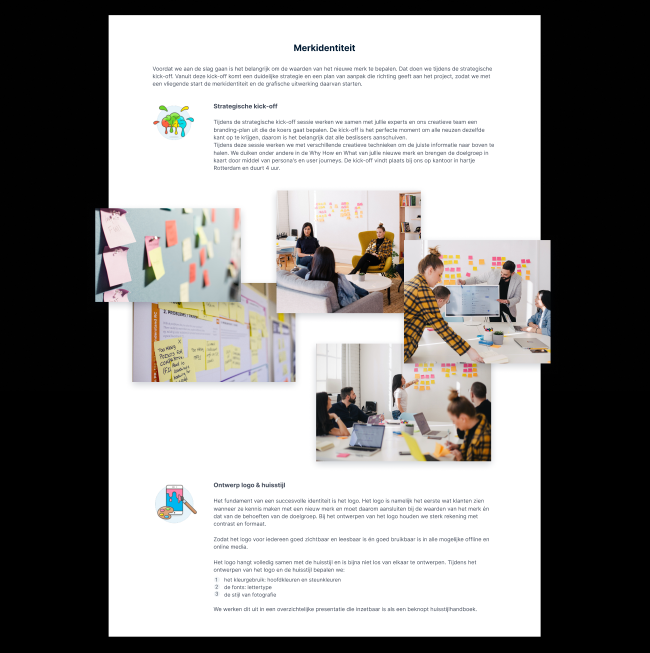 Laat zien waar jij goed in bent: visualiseren. Gebruik visuals, stilstaand of bewegend, om je offerte te versterken. Met Offri maak je gemakkelijk een interessant en duidelijk geheel.