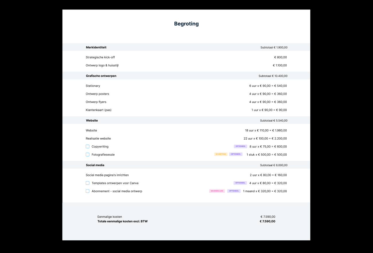 Schrijf één keer al je teksten, ondersteun deze met visuals, voer alvast de prijs in voor je werkzaamheden. De begroting word automatisch berekend tijdens het maken van je offerte.