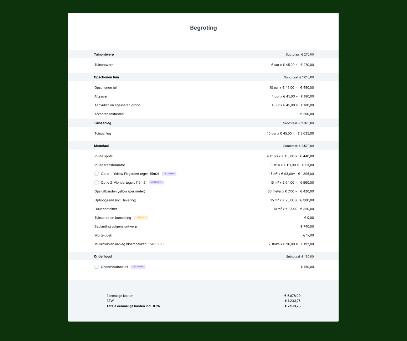 Daarnaast kan je de templates van de voorbeeld offertes ook hergebruiken. Zo kan je snel en gemakkelijk een gerichte offerte maken met bijpassende foto’s uit jouw eigen portfolio.