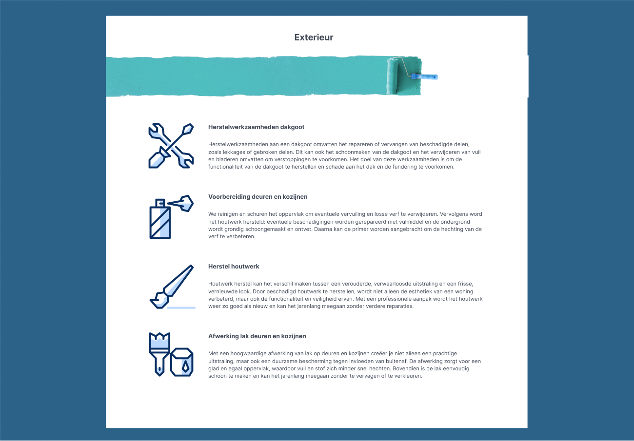 Zeg vaarwel tegen die onaantrekkelijke Excel-spreadsheets voor je begroting. Vul je catalogus met informatie over je werkzaamheden, materialen, kosten en aanpak. En gebruik beelden van eerdere projecten om te laten zien wat je in huis hebt. Zo onderscheid je jezelf van andere schilders met duidelijke offertes die je super snel in elkaar zet.