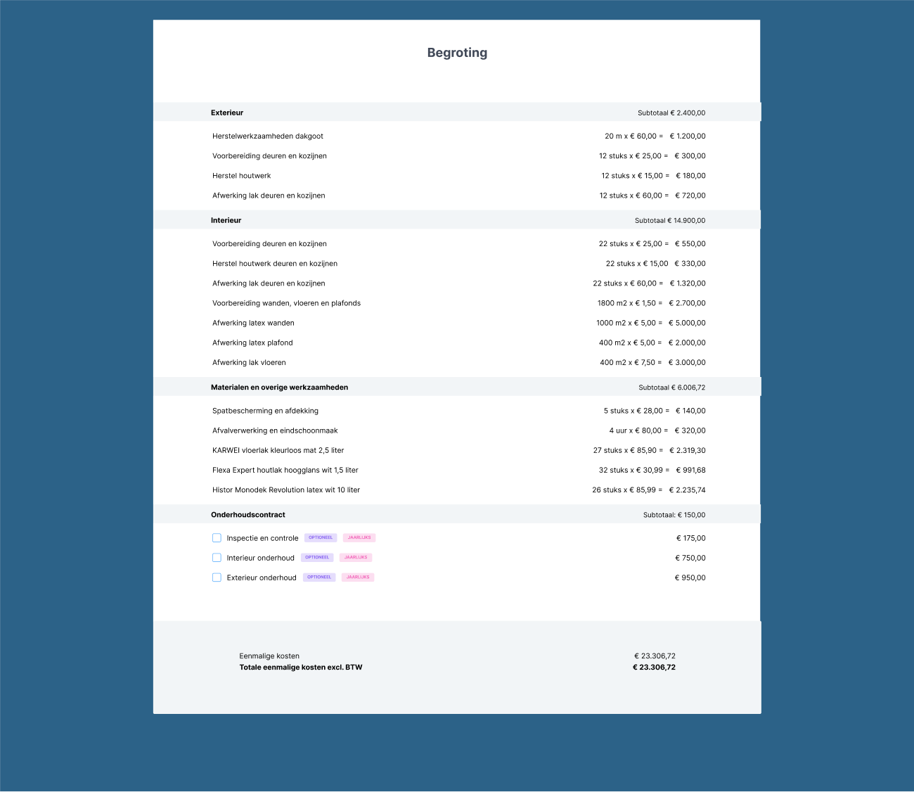 Ook een ingewikkelde begroting laat je in Offri overzichtelijk zien aan je klant. De begroting wordt automatisch berekend op basis van de producten in de offerte.