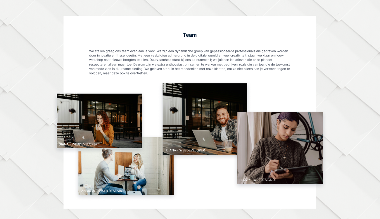 Niks overtuigt een klant beter van jouw fantastische diensten als een enthousiast team. Stel je team voor door een collage toe te voegen van je collega's. Vertel iets over jezelf en je team.